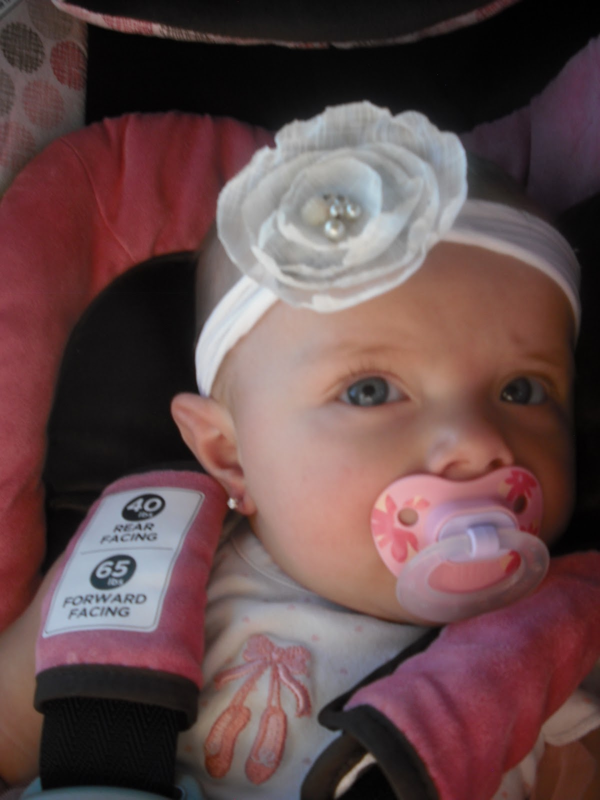 Modeling one of the cute flowers I made for her. 6 weeks old